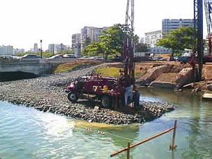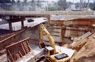 Bridge over PR-18 in San Juan. Vertical cut (11.5 meters, 38 feet) using soil nails along existing bridge for construction of new bridge abutment.