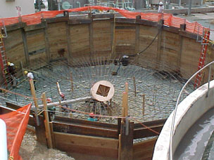 View of 15-foot excavation within highly congested treatment plant, dewatered using single interior sump pump and gravel mat with H-piles and wood lagging.