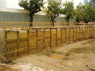 Excavation next to Atlantic Ocean in Isla Verde, Puerto Rico - dewatered using combination trench drain and wellpoint system. Note wood lagging retention system.